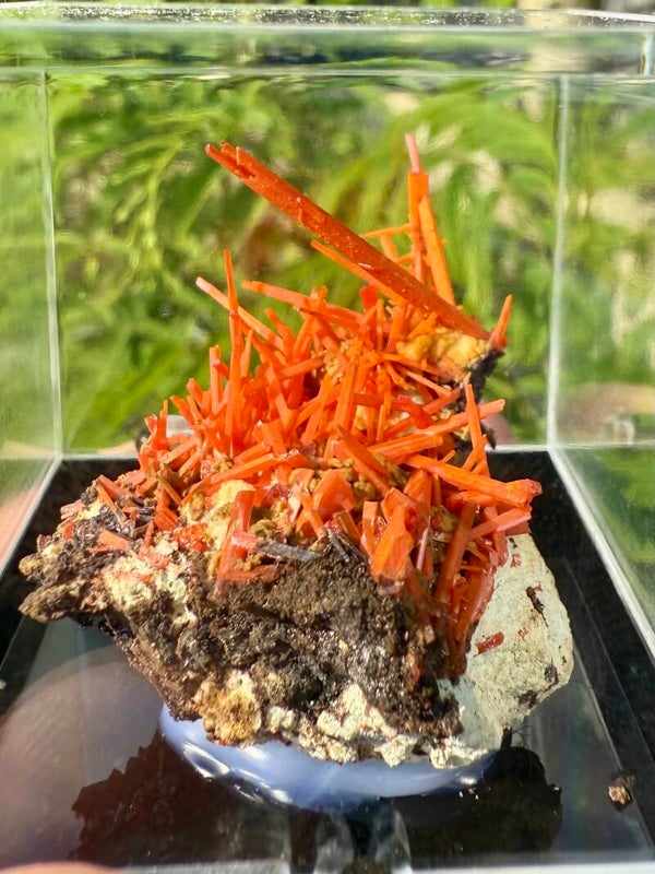 Wunderschöner und farbintensiver Crocoit mit zahlreichen langen Kristallspitzen. Wie auf den Bildern ersichtlich ist der Crocoit in eine Präsentationsbox fest verklebt und kann nicht herausgenommen werden.